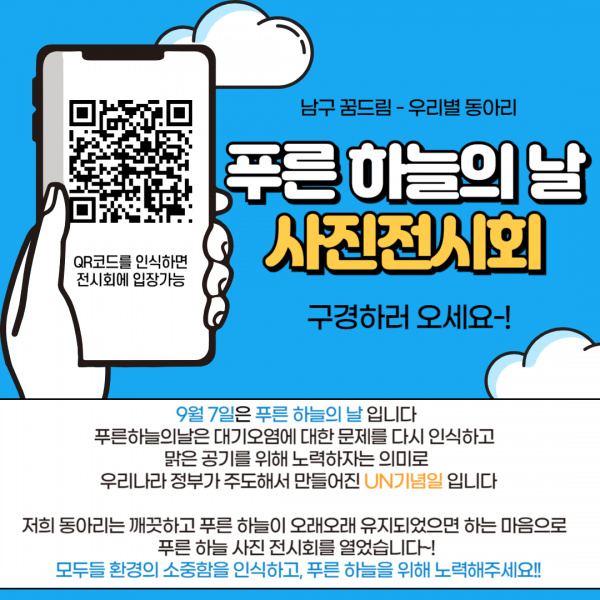 9월 7일 푸른 하늘의 날을 기념하며 동아리 친구들과 함께 푸른 하늘 사진 전시회를 열었습니다~!