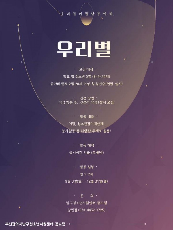 학교 밖 청소년들이 직접 만들어 가는 우리별 동아리 참여자를 모집합니다.