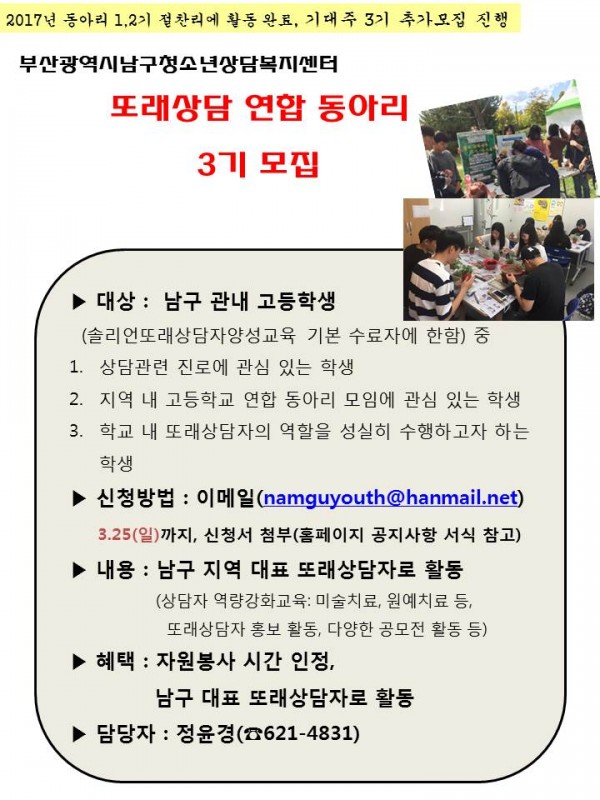 남구를 대표하는 또래상담 연합 동아리 3기를 모집합니다.