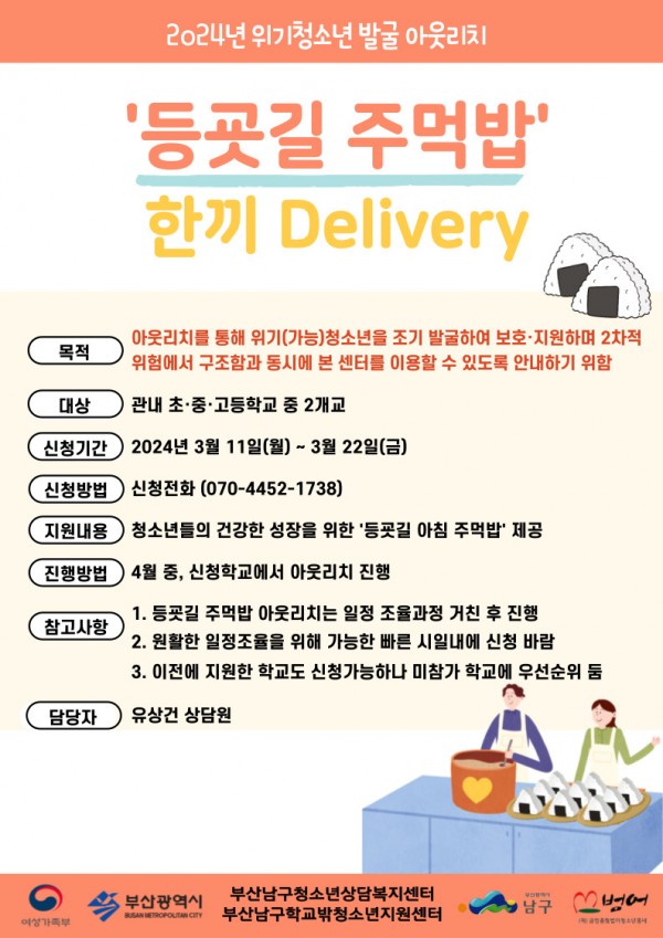 본 센터에서 2024년 위기청소년 발굴 ‘등굣길 주먹밥’ 아웃리치를 아래와 같이 진행하고자 합니다.