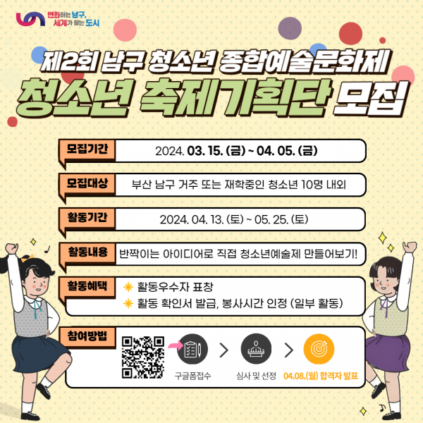 2024 남구 청소년 종합예술문화제를 함께 만들어갈 청소년 축제기획단을 모집합니다.