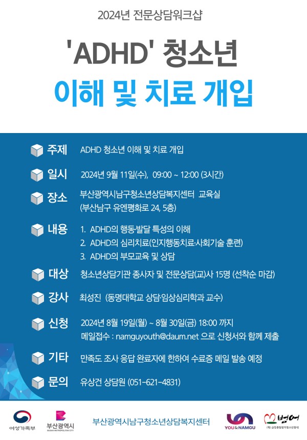 2024년 전문상담워크샵 [ADHD 청소년 이해 및 치료 개입] 안내