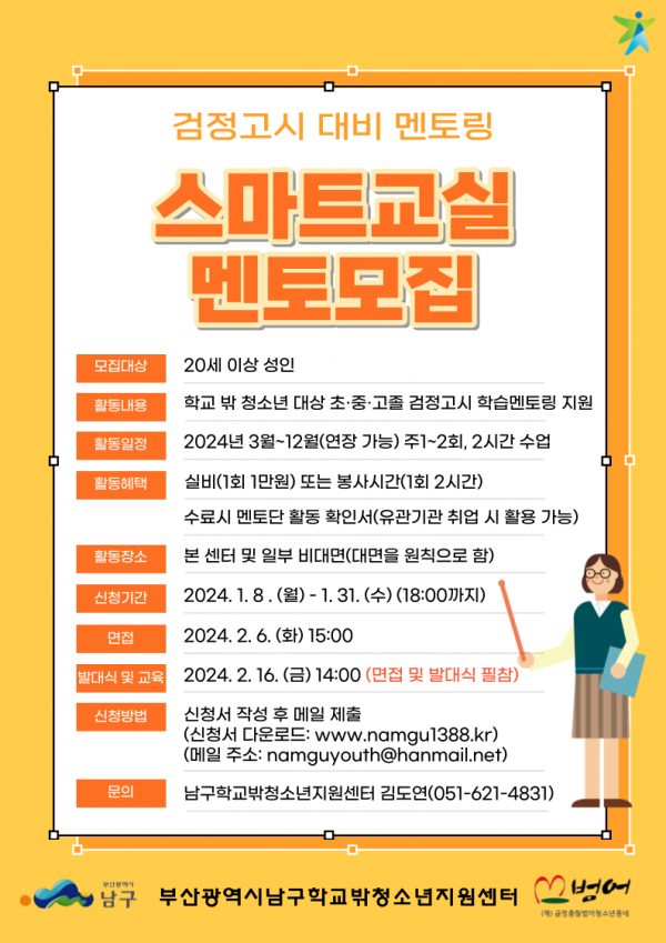 [부산광역시남구학교밖청소년지원센터 스마트교실 멘토단 모집 안내]