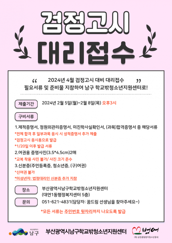 2024년 제1회 검정고시 대리접수 페이지 정보 작성자 최고관리자 작성일24-02-02 14:40 조회276회 댓글0건 본문 2024년 제1회 검정고시 대리접수가 2/5(월)~2/8(목) 오후3시까지 진행됩니다. 필요 서류와 준비물 챙기셔서 센터 방문해주시면 됩니다^^ 이전글 다음글 목록