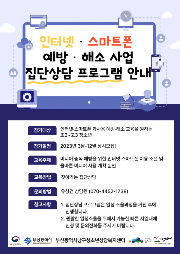 2023년도 인터넷 스마트폰 중독예방해소 집단상담프로그램 안내 페이지 정보 작성자 최고관리자 작성일23-02-14 10:44 조회1,036회 댓글0건 본문 집단상담프로그램을 진행 하오니 많은 관심과 참여 부탁드립니다 :) 이전글 다음글 목록