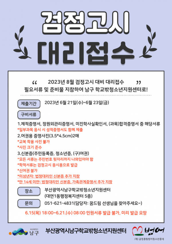 2023년 제2회 검정고시 대리접수가 6/21(수)~6/23(금)까지 진행됩니다. 필요 서류와 준비물 챙기셔서 센터 방문해주시면 됩니다^^