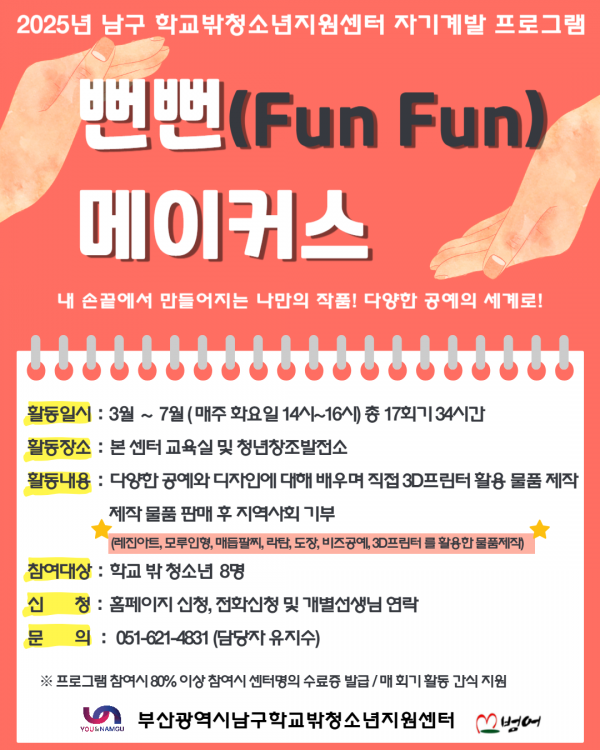 남구학교밖청소년지원센터 자기계발 프로그램 '뻔뻔(FunFun)메이커스'프로그램 참여자 모집