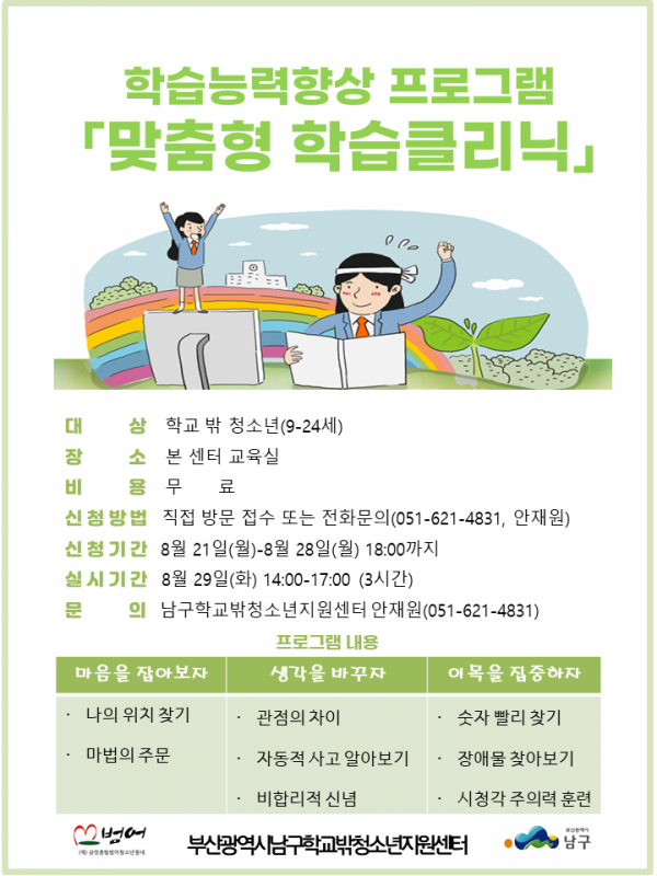 부산남구학교밖청소년지원센터 맞춤형학습클리닉 참여자 모집