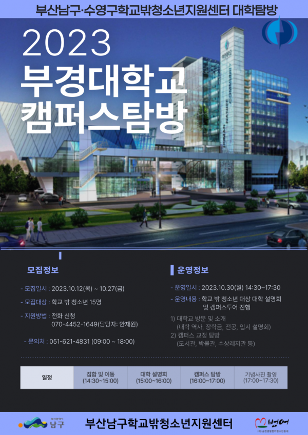남구학교밖청소년지원센터 부경대학교 대학탐방 참여자 모집 페이지 정보 작성자 최고관리자 작성일23-10-18 16:32 조회244회 댓글0건 첨부파일 일시 : 10월 30일(월), 14:30~17:30 장소 : 부경대학교 캠퍼스 내용 : 부경대학교 캠퍼스 투어 및 입시설명회, 학과 소개 등 문의 : 051-621-4831(안재원)