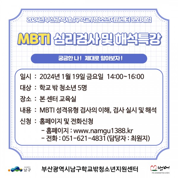 남구학교밖청소년지원센터 문화체험 'MBTI 심리검사 및 해석특강' 참여자 모집