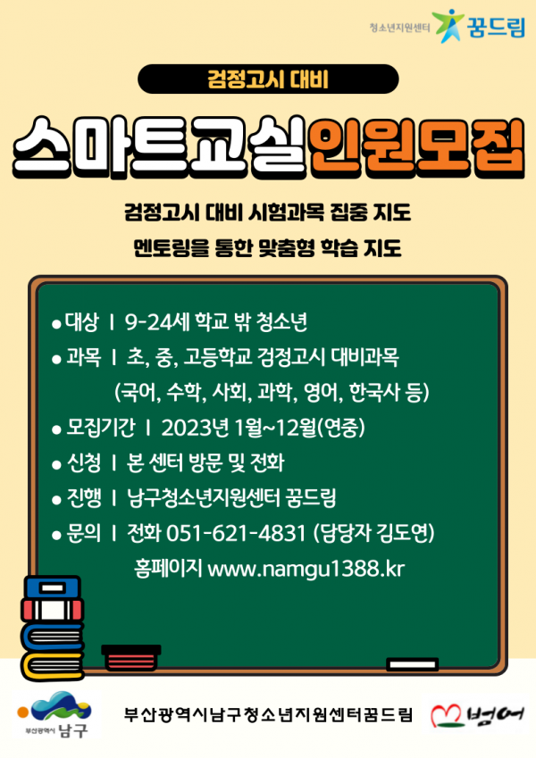 2023년 검정고시 대비 스마트교실 참여 인원 모집 페이지 정보 작성자 최고관리자 작성일23-03-02 10:30 조회789회 댓글1건 첨부파일 검정고시 대비 스마트교실 수업 참여 인원을 모집합니다! 일시 : 연중수시/월별 시간표에 따라 수업 진행 장소 : 남구학교밖청소년지원센터 교육실(대연1동 행정복지센터 5층) 대상 : 학교 밖 청소년 문의 : 051-621-4831