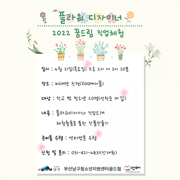 2022년 1차 꿈드림 직업체험(플라워디자이너) 참여 인원 모집