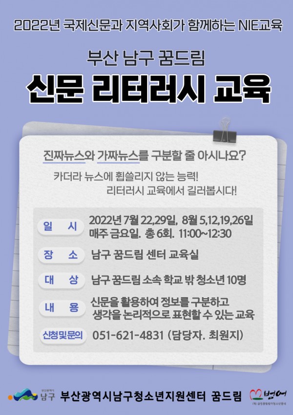 남구 꿈드림) 2022년 국제신문과 지역사회가 함께하는 NIE교육 (신문 리터러시 교육) 참여자 모집