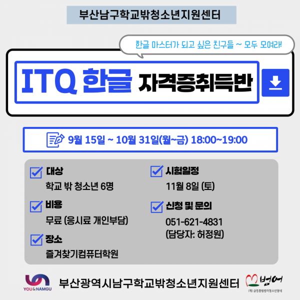 남구학교밖청소년지원센터 자격증취득반(ITQ 한글) 참여 청소년 모집